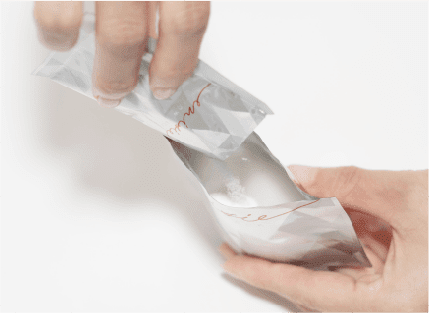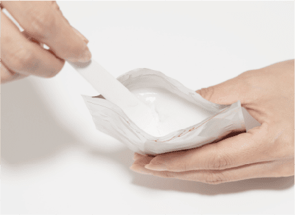 2料(ジェル)をパウチ袋のマチ部分に押し集めて袋を起立させます。