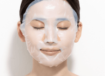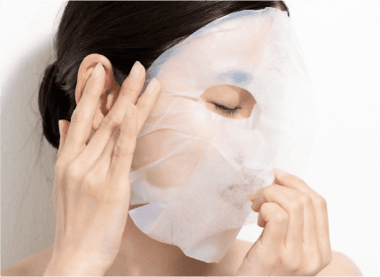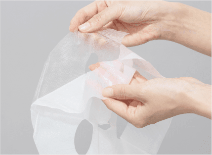 不織布を剥がした面を顔にのせ、目と口の位置を合わせてフィットさせてからもう片方の不織布を外します。